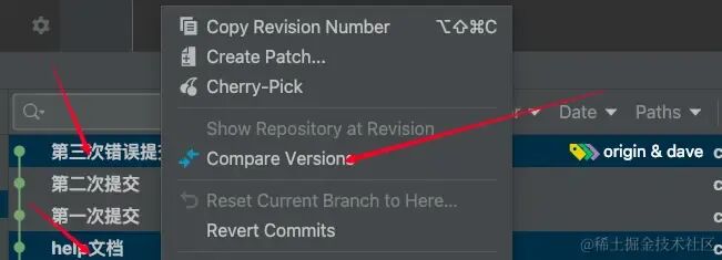 按住 ctrl 选择想要对比的两个commit,然后选择 Compare Versions 就能通过对比删除掉你想要删除的代码。