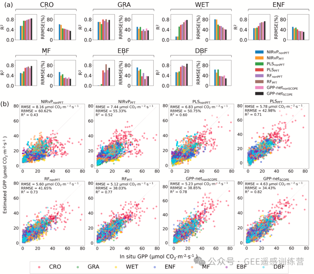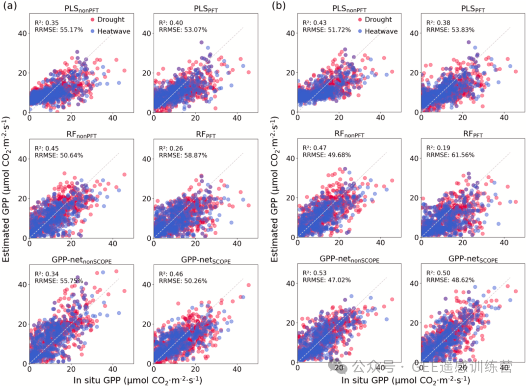 图 11.干旱和热浪期间的总初级生产力(GPP)估算结果。横轴为实地观测 GPP,纵轴为估算 GPP;灰色虚线表示等值线(观测值与预测值相等)。(a)不将水汽压亏缺(VPD)作为预测因子的结果;(b)将 VPD 作为预测因子的结果。有无 VPD 的模型使用相同数据集训练,唯一差异在于是否将 VPD 纳入预测因子。整个实验过程中,GPP-net 均不使用 PFT 信息。