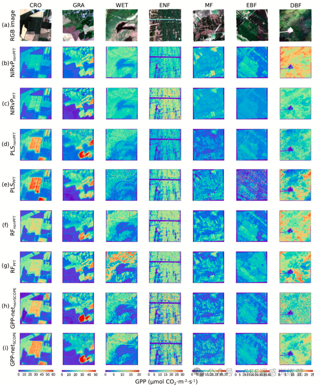 图 7. 不同功能型植物类型(PFT)的哨兵 2 号(Sentinel-2)瞬时总初级生产力(GPP)制图结果。分别选取 FR-Lam(法国朗格多克)、BE-Dor(比利时多尔)、US-BZF(美国本泽尔维尔)、IT-SR2(意大利圣雷莫)、BE-Vie(比利时维耶)、IT-Cp2(意大利卡普里)和 US-Rpf(美国罗斯福)站点周边区域,对应绘制农田(CRO)、草地(GRA)、湿地(WET)、常绿针叶林(ENF)、混交林(MF)、常绿阔叶林(EBF)和落叶阔叶林(DBF)的 GPP 图。(a)RGB 影像;(b)不使用 PFT 信息的近红外植被指数(NIRvPnonPFT)方法结果;(c)使用 PFT 信息的近红外植被指数(NIRvPPFT)方法结果;(d)不使用 PFT 信息的偏最小二乘(PLSnonPFT)方法结果;(e)使用 PFT 信息的偏最小二乘(PLSPFT)方法结果;(f)不使用 PFT 信息的随机森林(RFnonPFT)方法结果;(g)使用 PFT 信息的随机森林(RFPFT)方法结果;(h)不使用 SCOPE 数据集预训练的 GPP-net(GPP-netnonSCOPE)结果;(i)使用 SCOPE 数据集预训练的 GPP-net(GPP-netSCOPE)结果。所用实地光合有效辐射(PAR)数据与哨兵 2 号过境时间相匹配。整个实验过程中,GPP-net 均不使用 PFT 信息。