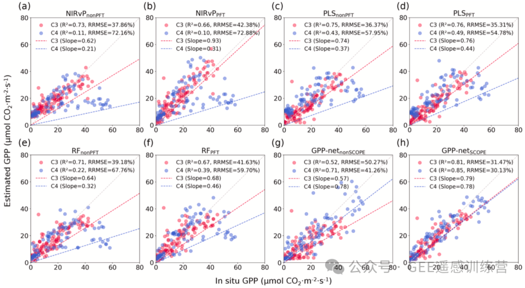 图 10. C3 和 C4 植被总初级生产力(GPP)预测结果对比。灰色虚线表示等值线(观测值与预测值相等);红色虚线表示 C3 植被 GPP 预测结果的趋势线;蓝色虚线表示 C4 植被 GPP 预测结果的趋势线。(a)不使用 PFT 信息的近红外植被指数(NIRvPnonPFT)方法结果;(b)使用 PFT 信息的近红外植被指数(NIRvPPFT)方法结果;(c)不使用 PFT 信息的偏最小二乘(PLSnonPFT)方法结果;(d)使用 PFT 信息的偏最小二乘(PLSPFT)方法结果;(e)不使用 PFT 信息的随机森林(RFnonPFT)方法结果;(f)使用 PFT 信息的随机森林(RFPFT)方法结果;(g)不使用 SCOPE 数据集预训练的 GPP-net(GPP-netnonSCOPE)结果;(h)使用 SCOPE 数据集预训练的 GPP-net(GPP-netSCOPE)结果。整个实验过程中,GPP-net 均不使用 PFT 信息。决定系数(R²)为实地观测 GPP 与预测 GPP 之间的皮尔逊相关系数平方;斜率为强制过原点(即截距 = 0)的线性回归系数,该回归以估算 GPP 为因变量、观测 GPP 为自变量拟合得到。