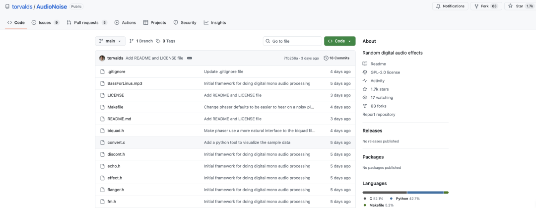 这个新项目采用 GPLv2 许可证,目前代码已经发布在 GitHub 的 torvalds/AudioNoise 仓库中。