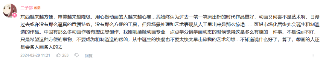 不过也有很多观众认为这是一部“技术探索大于内容本身”,是一个具有实验价值的事情。毕竟在AI大时代里面,总需要有一群人去尝试和探索这样的事情。