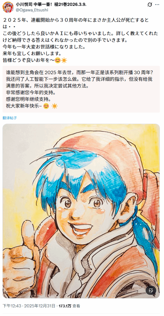 但是用户担心的则是,很多创作者并不是把AI当作辅助工具,而是当作生产工具,从剧本开始就进行大量的AI生成,比如目前把中华小当家刘昴星画死之后,作者小川悦司表示自己甚至向AI询问接下来的剧情要如何发展,都没有得到很好的答复。