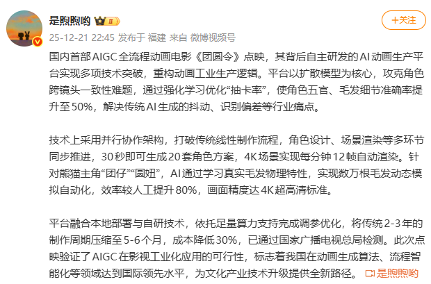 根据相关资料显示,《团圆令》依托CMG大型媒体内容模型,实现了从镜头、段落到成片的全程AI制作,有效解决了动画制作中角色形象一致、跨场景衔接、微表情生动等常见难题,并将动画电影通常需2~3年的制作周期压缩至5~6个月,兼顾效率与品质。