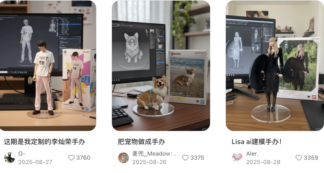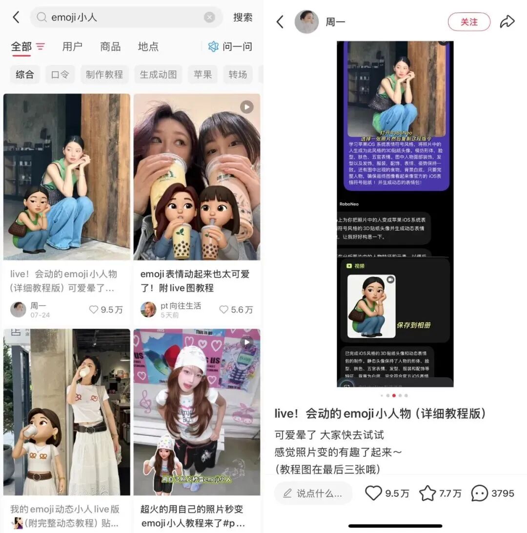 更重要的是,具备低门槛、个性表达和社交属性。比如苹果风动态emoji、3D手办等等,它们不仅是AI内容,更是用户用来表达自我、进行社交互动的工具。