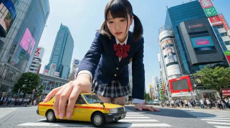 参考提示词:超精细、逼真的镜头角度,「广角镜头、俯拍航拍、极低角度仰拍」,展现一个巨大的「人物描述及穿着」站在「具体地点/城市/景观」。这个巨人正在「动作——与环境互动,例如:坐在建筑物上、跨过桥梁」。为了体现其惊人的尺寸,脚边或手边还可见到微小的「微小元素:行人、汽车或船只」。光线为「时间段,例如:金色时刻、正午阳光」。