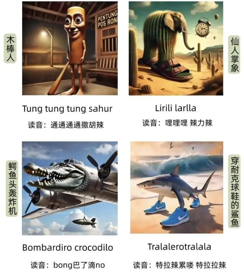 所谓的AI山海经,其实是用AI将两个毫不相关的物种或物品“杂交”,比如穿着耐克鞋的鲨鱼、长得像根木棍的木棍人。按照这个逻辑,就能创作出乌龟和蜂蜜结合出的“闺蜜”。这类创作不仅在视觉上追求猎奇,博主们还常常用超长的、如同乱码般的伪意大利语,为其命名,并用极速口播挑战作为吸睛噱头。