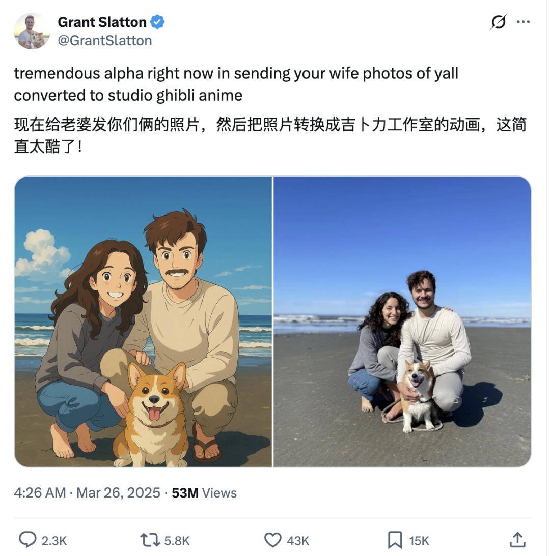 GPT-4o原生图像生成功能的上线,更是引发了一股“万物皆可吉卜力”的风潮。用户只需要上传一张现实照片,输入相应提示词,GPT-4o就能把照片转化成宫崎骏动漫风格。