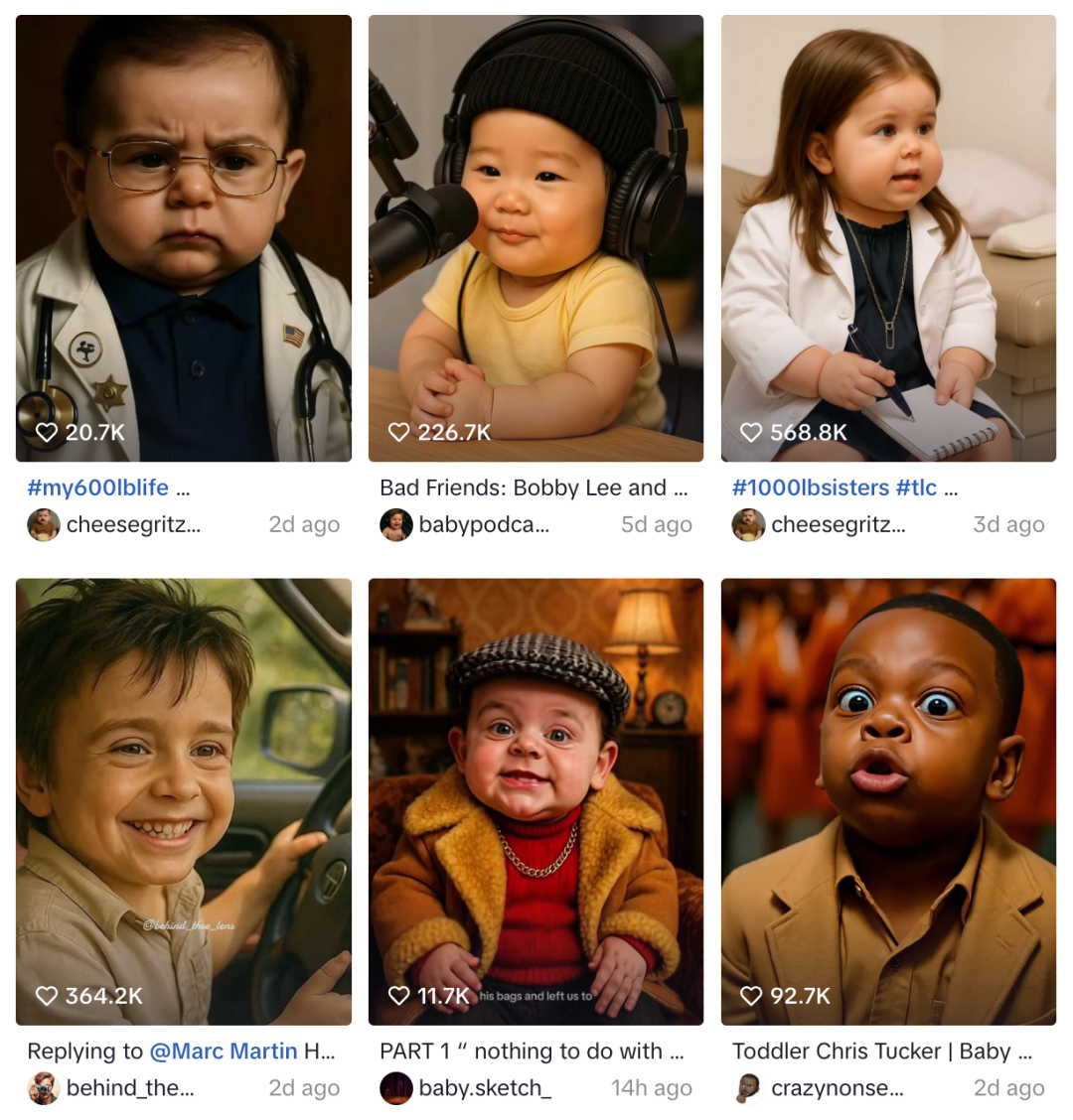 首先是极致的反差感。从AI宠物短剧到AI宝宝播客,核心都在于视觉形象和行为的错位。这种错位带来的荒诞感,才让AI生成的内容具备了天然的传播力。