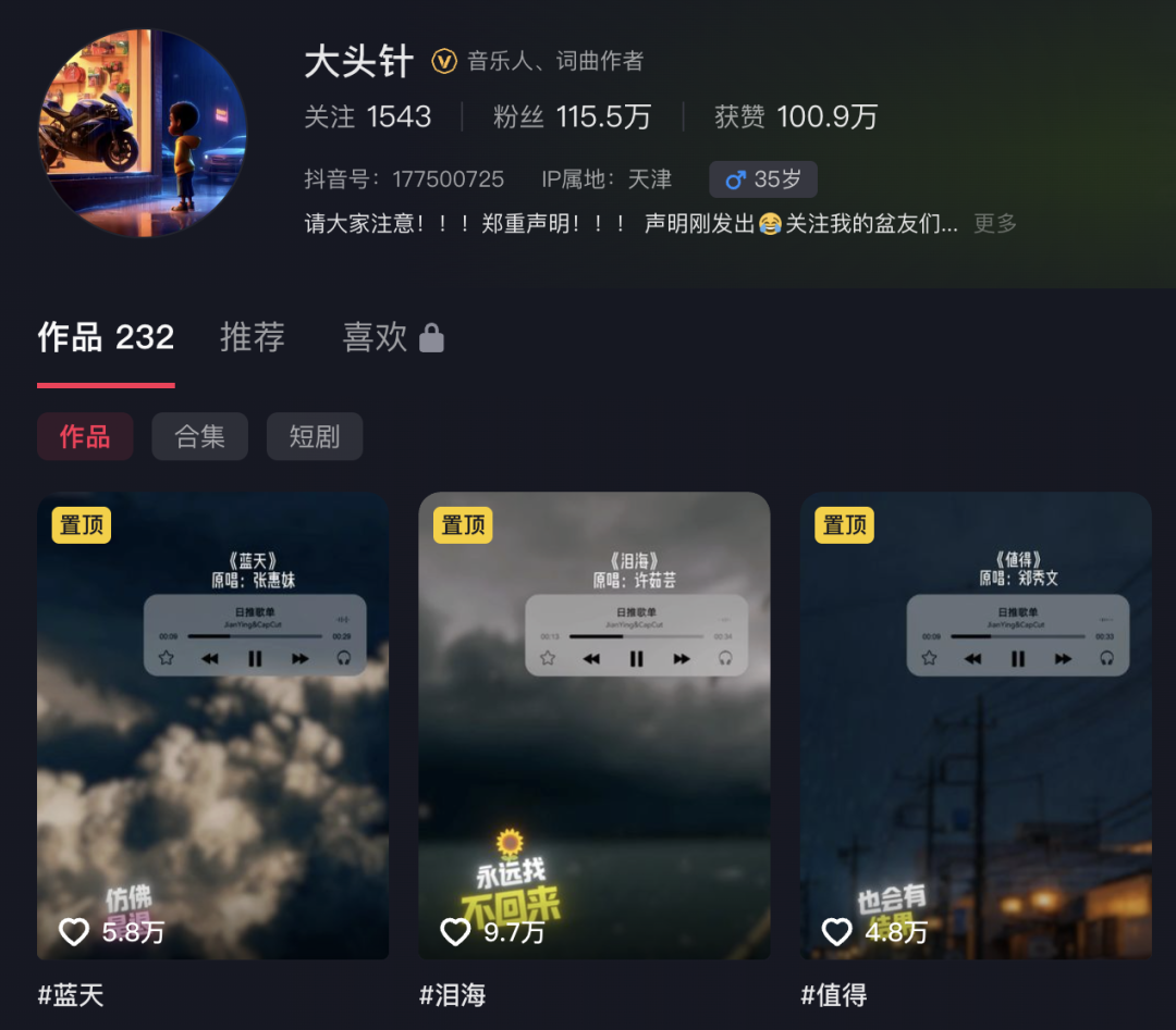 随着AI生成音乐技术的进步,以及Suno V5的发布,AI翻唱被玩出了新高度。抖音认证音乐人“大头针”凭借一系列AI翻唱歌曲视频,目前已涨粉超百万。