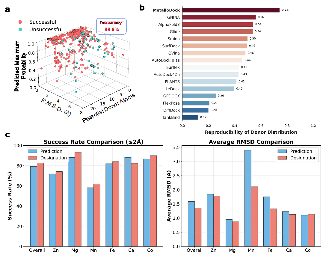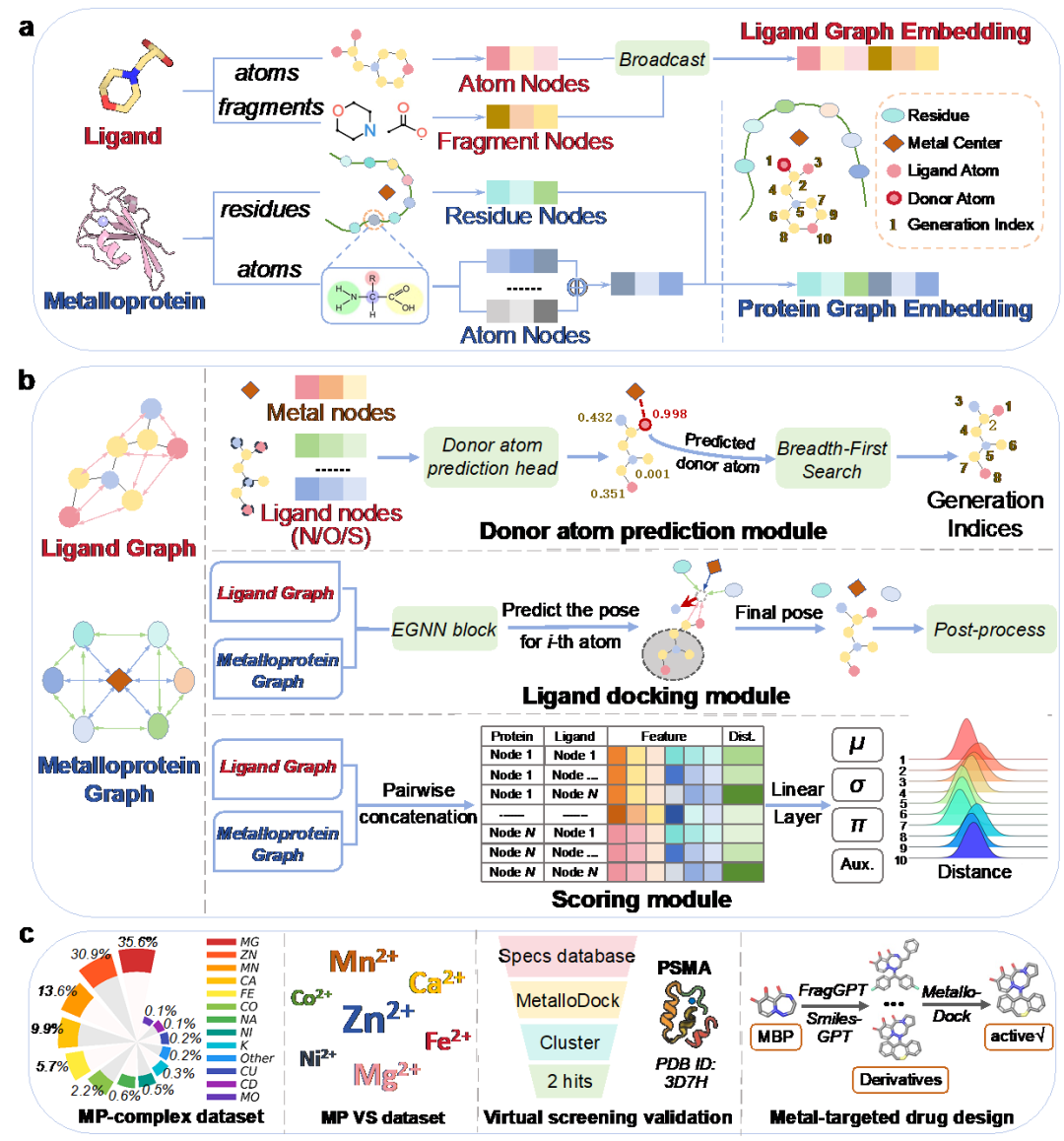 金属蛋白是生物体系中一类重要的功能蛋白,其通过与一种或多种金属离子形成特定配位结构,在核酸修饰和酶催化等多种生命过程中发挥关键作用。金属蛋白的功能异常往往与多种疾病的发展密切相关,因此,靶向金属蛋白已成为药物研发中的重要策略之一。然而,与常规蛋白–配体相互作用不同,金属–配体配位过程涉及复杂的电荷转移和极化效应,其配位几何构型也会随金属离子的氧化态、自旋态及周围化学环境的变化而发生调整,从而表现出灵活的配位数和方向性特征。这些因素使得传统分子对接方法及基于固定电荷力场的打分函数难以准确刻画金属配位体系,限制了其在金属蛋白靶点中的适用性。目前仅有少数分子对接工具针对金属蛋白进行了特化设计,且大多局限于锌离子体系,难以覆盖更复杂的金属配位环境。此外,现有深度学习对接模型大多未针对金属蛋白体系进行专门优化,且受限于高质量金属蛋白–配体数据的匮乏,其在金属介导相互作用建模方面仍存在明显不足。因此,发展面向金属蛋白体系的专用计算方法,并构建高质量数据资源,已成为推动金属蛋白靶向药物发现的关键挑战。