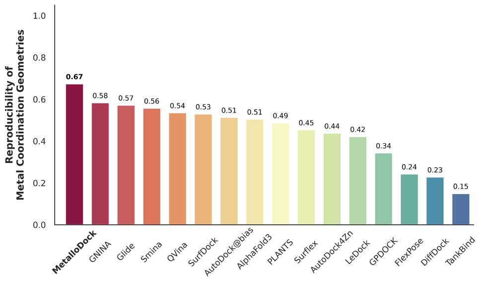 金属蛋白分子对接的核心挑战之一在于准确刻画金属–配体配位相互作用。研究团队从配位距离、配位角度和几何复现度等多个维度,对不同模型的金属配位几何构型重建能力进行了系统评估。结果显示,MetalloDock在配位距离预测上与晶体结构最为接近,在配位角度预测中亦表现优异。基于CMM平台的几何复现分析进一步表明,MetalloDock在多种金属配位环境下均保持较高的金属配位几何构型复现率,能够稳定重现实验中真实存在的金属配位模式。