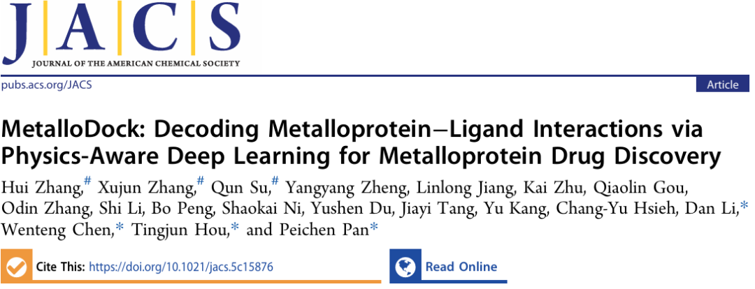 MetalloDock: Decoding Metalloprotein–Ligand Interactions via Physics-Aware Deep Learning for Metalloprotein Drug Discovery. Hui Zhang, Xujun Zhang, Qun Su, Yangyang Zheng, Linlong Jiang, Kai Zhu, Qiaolin Gou, Odin Zhang, Shi Li, Bo Peng, Shaokai Ni, Yushen Du, Jiayi Tang, Yu Kang, Chang-Yu Hsieh, Dan Li, Wenteng Chen, Tingjun Hou, and Peichen Pan. Journal of the American Chemical Society.