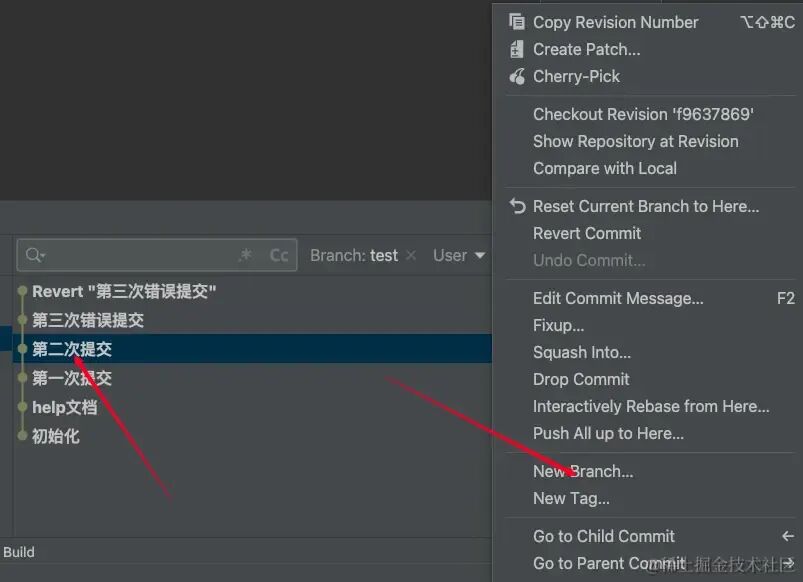 在想要回到的版本处的提交记录右键,点击new branch