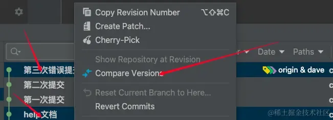 按住 ctrl 选择想要对比的两个commit,然后选择 Compare Versions 就能通过对比删除掉你想要删除的代码。