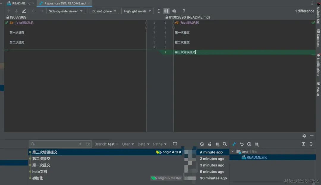 git自动产生一个Revert记录,然后我们会看到git自动将我第三次错误提交代码回退了,这个其实就相当于git帮我们手动回退了代码。