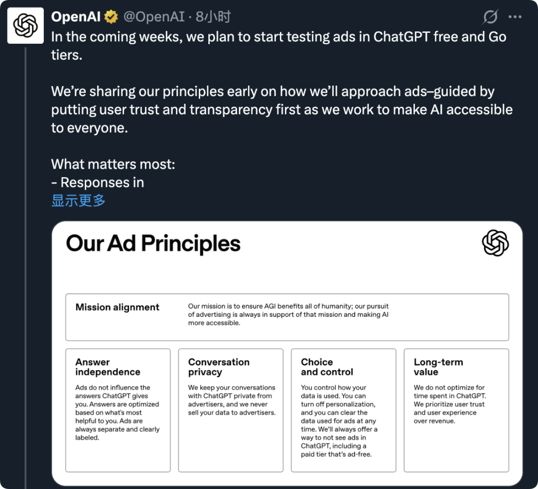 “广告不影响回答客观性,用户信任永远比收入重要”,OpenAI 强调这一核心原则,此前其 CEO 曾称广告是“最后的手段”,如今为平衡普惠与商业化,最终走上广告变现之路。