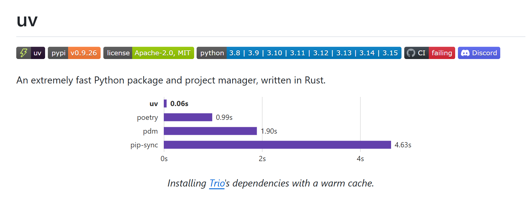 - 「统一工具链」:一个工具替代pip、pip-tools、pipx、poetry、pyenv、virtualenv等