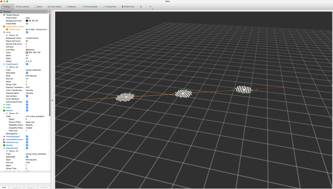 (global_plan_traj_.size () 7 ) { std::cout << std::endl; return ; } for (int i = 3 ; i < (int )global_plan_traj_.size () - 3 ; ++i) { const auto & current_point = global_plan_traj_[i]; bool collision = check_collision (current_point); if (!is_inside_obstacle && collision) { is_inside_obstacle = true ; current_segment.start = global_plan_traj_[i - 3 ]; current_segment.startIndex = i - 3 ; } else if (is_inside_obstacle && !collision) { is_inside_obstacle = false ; current_segment.goal = global_plan_traj_[i + 3 ]; current_segment.goalIndex = i + 3 ; intersection_points_.push_back (current_segment); } } if (is_inside_obstacle) { return ; current_segment.goal = global_plan_traj_.back (); current_segment.goalIndex = (int )global_plan_traj_.size () - 1 ; intersection_points_.push_back (current_segment); } } * @brief 合并相邻障碍物段 * @param merge_dist_threshold— 距离阈值(两段之间的缝隙距离) */ void manager::merge_adjacent_segments () { if (intersection_points_.size () 2 ) return ; std::vector merged_results; intersectionPoints current_proc = intersection_points_[0 ]; for (size_t i = 1 ; i < intersection_points_.size (); ++i) { const auto & next_seg = intersection_points_[i]; float dx = current_proc.goal.x - next_seg.start.x; float dy = current_proc.goal.y - next_seg.start.y; float dz = current_proc.goal.z - next_seg.start.z; float gap_dist = std::sqrt (dx*dx + dy*dy + dz*dz); if (gap_dist <= merge_threshold_) { current_proc.goal = next_seg.goal; current_proc.goalIndex = next_seg.goalIndex; } else { merged_results.push_back (current_proc); current_proc = next_seg; } } merged_results.push_back (current_proc); intersection_points_ = std::move (merged_results); } * @brief 执行避障路径重规划并组合最终路径 */ void manager::replan_and_combine_path () { final_path_.clear (); int last_processed_idx = 0 ; for (const auto & segment : intersection_points_) { for (int i = last_processed_idx; i < segment.startIndex; ++i) {