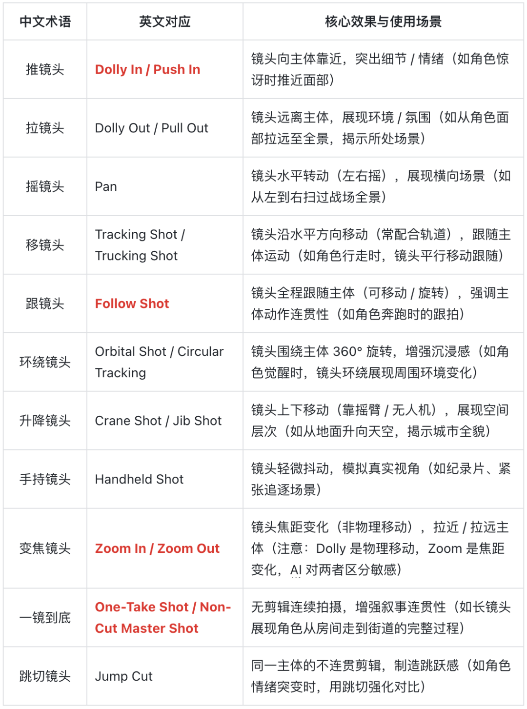 e.g. 镜头往前推 那到底是 焦段放大的推(zoom in) 还是 轨道推(dolly in) 还是 手持推(handheld in) ,是有区别的
