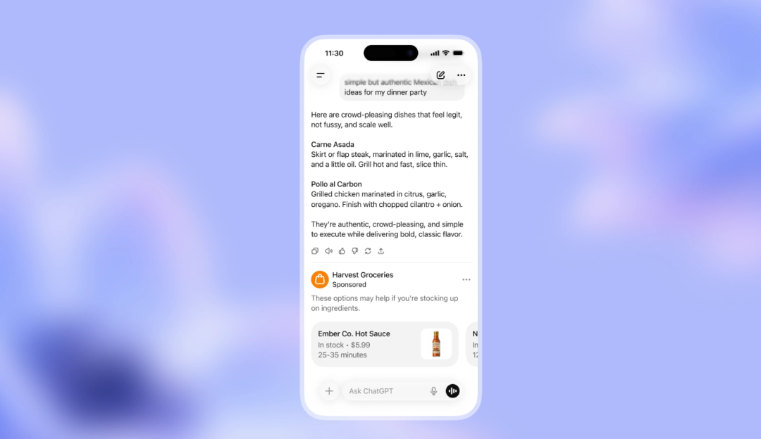作为背景,OpenAI上周五宣布扩大实惠订阅套餐ChatGPT GO(每月8美元)的适用地区,并披露即将开始在美国地区的免费和ChatGPT GO订阅用户中测试广告投放。作为仅有的信息,OpenAI仅透露可能会在用户查询菜谱时跳出某些酱料品牌的广告,同时保证广告会独立呈现并单独标注,AI聊天机器人的回答中不会包含广告。