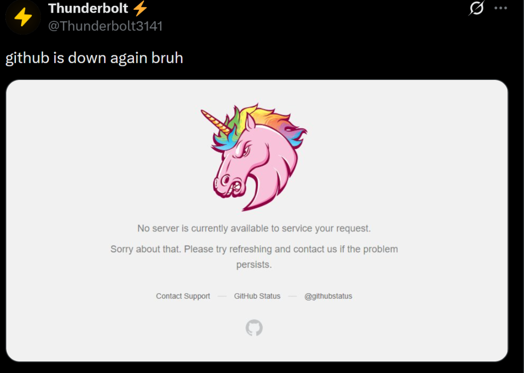 “所有用户都被强制登出,我自己也登不进去,因为整个服务器都宕机了。”“我以为是自己眼花了,但 GitHub 真的宕机了。很多团队都在周四收尾迭代冲刺,这次故障怕是要导致大量工作项顺延。”“更新即将发布时,登录网站就崩溃了。”“尴尬的时刻:你意识到自己过去一个小时一直在本地提交代码,却无法推送。”“天哪,我现在该怎么给经理汇报啊。”