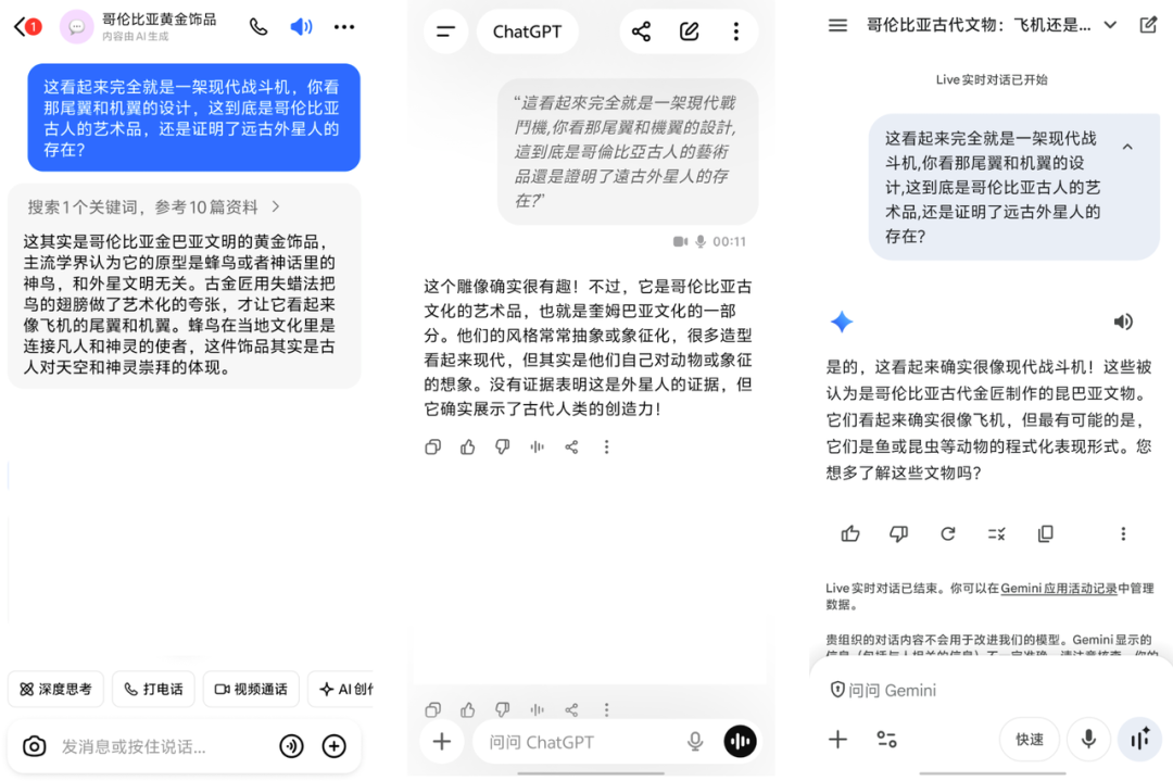 最后还有那架酷似现代战斗机的金巴亚黄金飞机,我对着 AI 们好奇发问:「这看起来完全就是一架现代战斗机,你看那尾翼和机翼的设计。这到底是哥伦比亚古人的艺术品,还是证明了远古外星人的存在」。