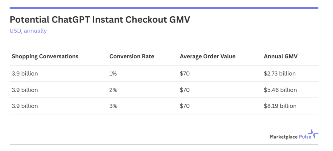Marketplace Pulse还声称,去年OpenAI的一份研究表明,2.1%的ChatGPT对话与购物相关,并据此推算ChatGPT每年将会有40亿次与产品相关的对话,如果假定商品的转化率为2%、平均客单价为70美元,也将产生数十亿美元的GMV。