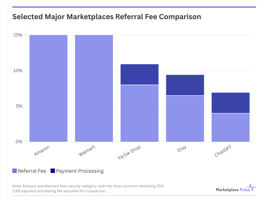 市场研究机构Marketplace Pulse称,与亚马逊15%的推荐费、沃尔玛6%-15%、TikTok Shop约8%的费率相比,即便是算上Shopify本身2.9%的支付费率,ChatGPT的费率也极具竞争力。