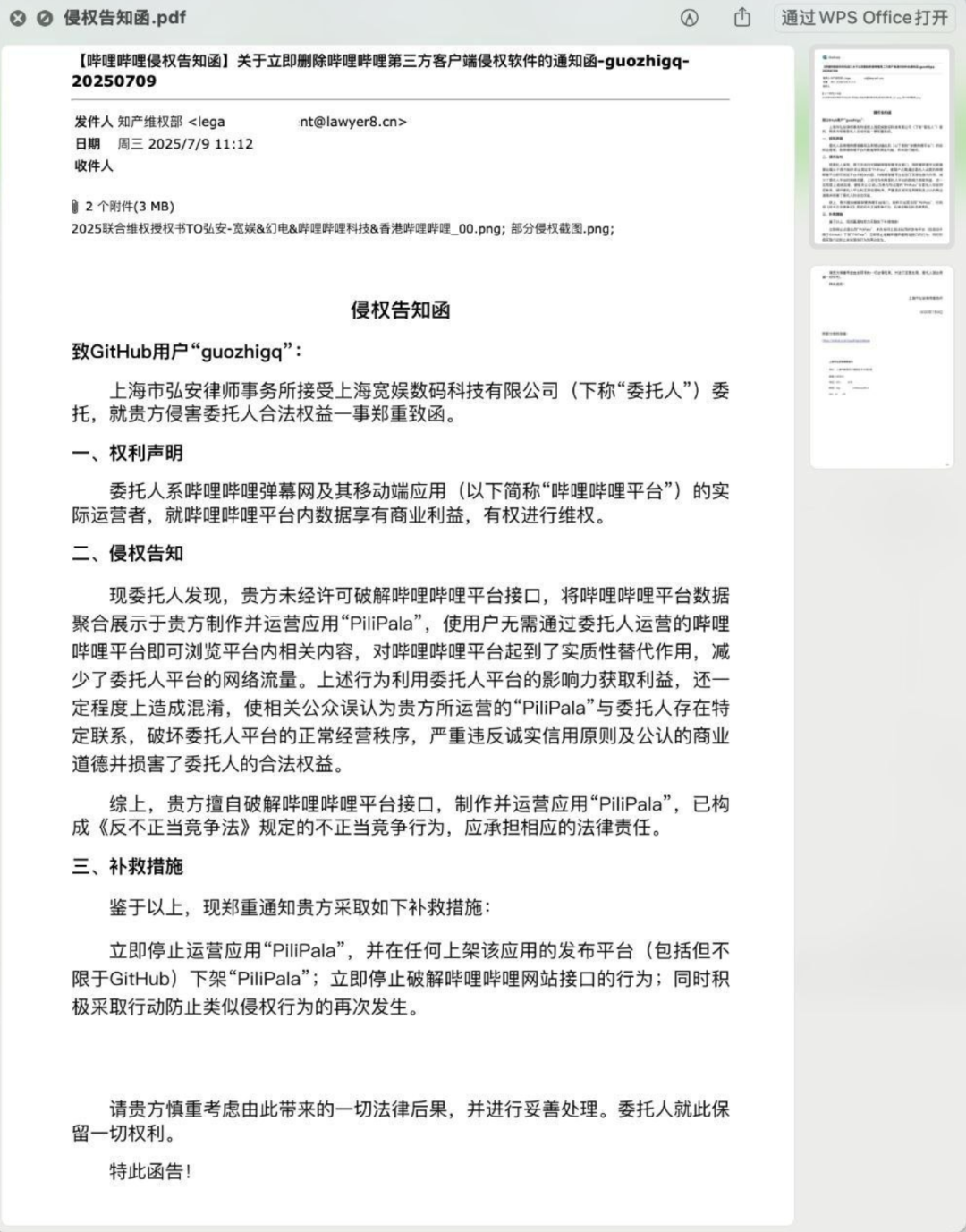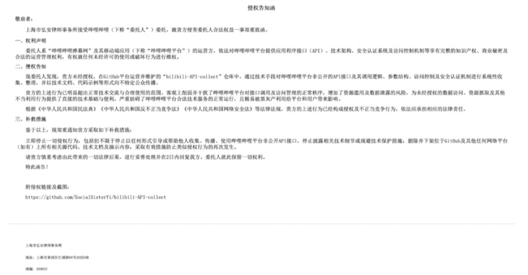 “2026 年 1 月 28 日,本仓库维护者收到B站委托的律师事务所发律师函警告邮件,指控本仓库中的项目存在“通过技术手段对哔哩哔哩平台非公开的 API 接口及其调用逻辑、参数结构、访问控制及安全认证机制进行系统性收集、整理,并以技术文档、代码示例等形式向不特定公众传播”的侵权行为。即日起停止维护并删除相关文档及源代码。“