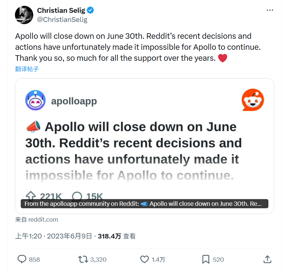 2023 年国外的 Reddit 为了干掉第三方客户端 Apollo,直接给 API 定了个天价,逼得开发者原地解散。