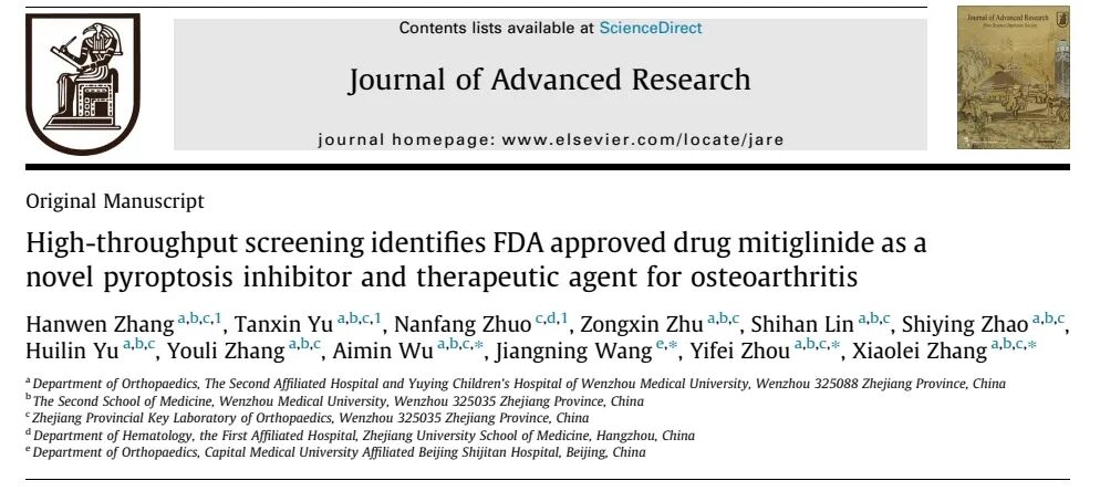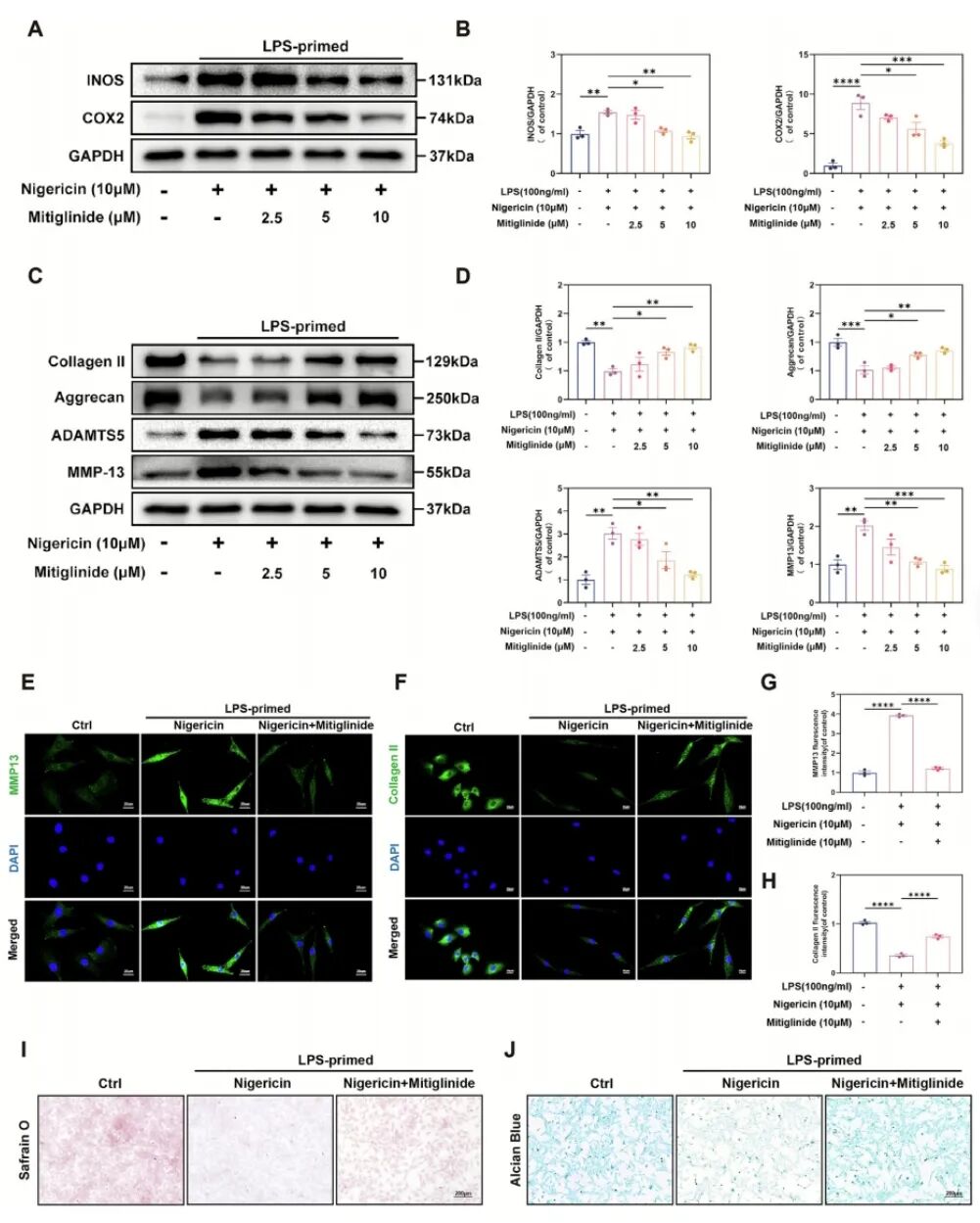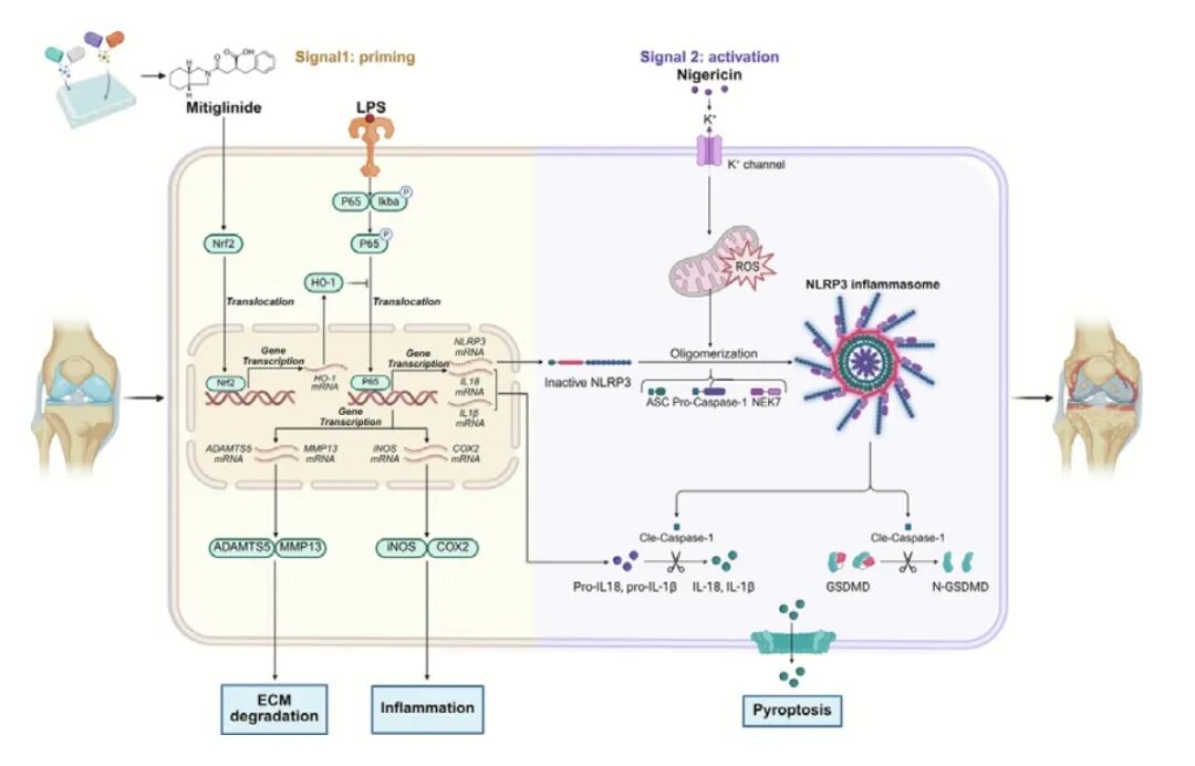 保护软骨基质: 米格列奈上调了软骨合成关键蛋白(II型胶原、聚蛋白聚糖),下调了降解酶(MMP13, ADAMTS-5)。