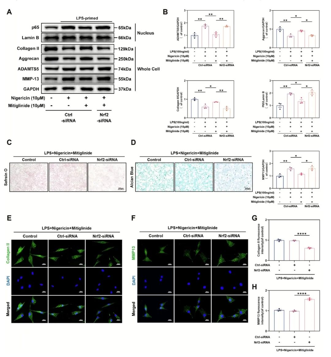 敲低Nrf2同样逆转了米格列奈对ECM的保护作用(II型胶原和聚蛋白聚糖减少,MMP13等增加),证实其调节ECM稳态也通过Nrf2介导。