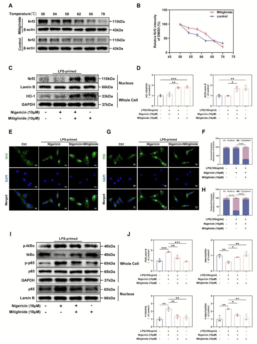 激活Nrf2通路:细胞热位移实验证明米格列奈与Nrf2直接结合。实验显示它能促进Nrf2核转位,并上调其下游抗氧化蛋白HO-1的表达。