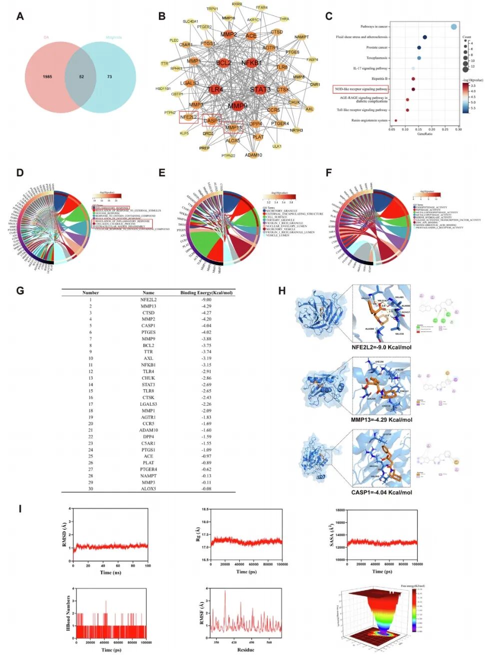 网络药理学预测: 分析预测米格列奈与OA存在52个共同靶点,关键通路包括NOD样受体信号通路。核心枢纽基因指向转录因子NFE2L2(即Nrf2)。