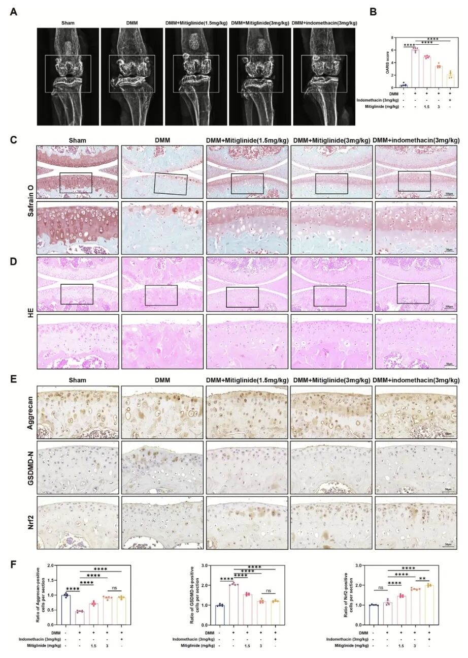 整体改善: 在DMM诱导的OA小鼠模型中,口服米格列奈能显著减轻关节损伤(X射线)、降低组织学OARSI评分,并改善软骨结构(番红O/HE染色)。