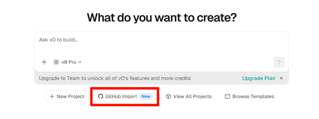 AI 代码生成工具 V0 新增从 GitHub 直接导入项目功能,用户现在可以一键从 GitHub 导入已有项目。