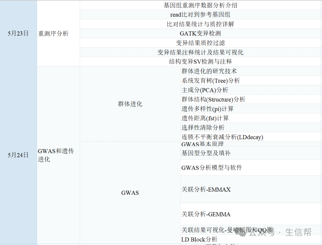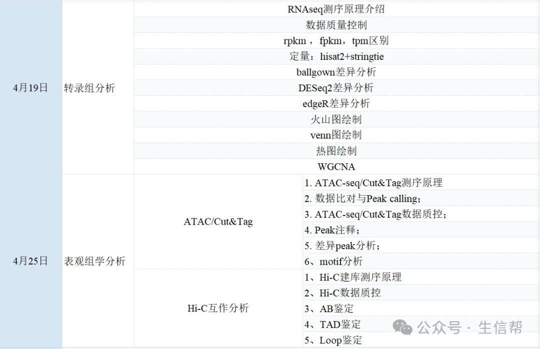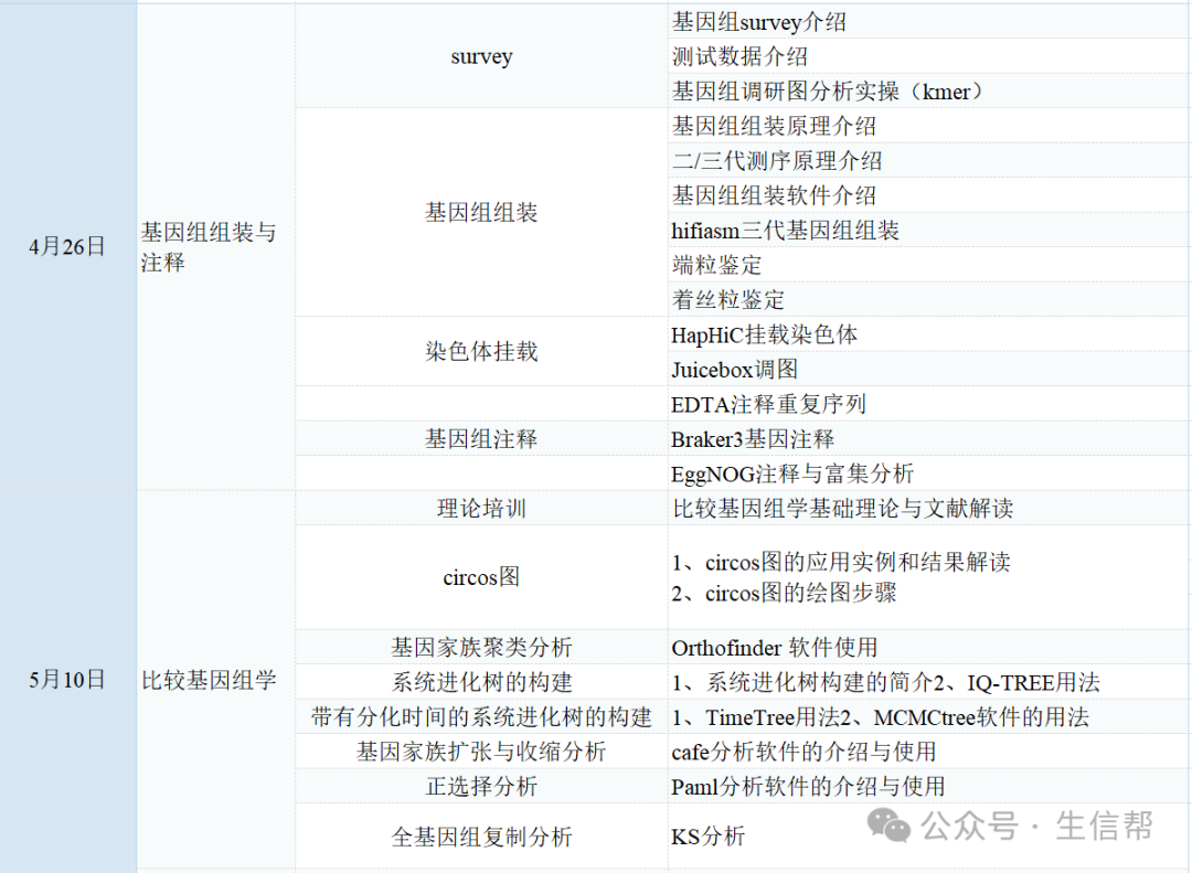 课程围绕“基因家族分析”“RNA-seq转录组”“T2T与比较基因组学”“WGS重测序”“单细胞与空间转录组”及“表观组学