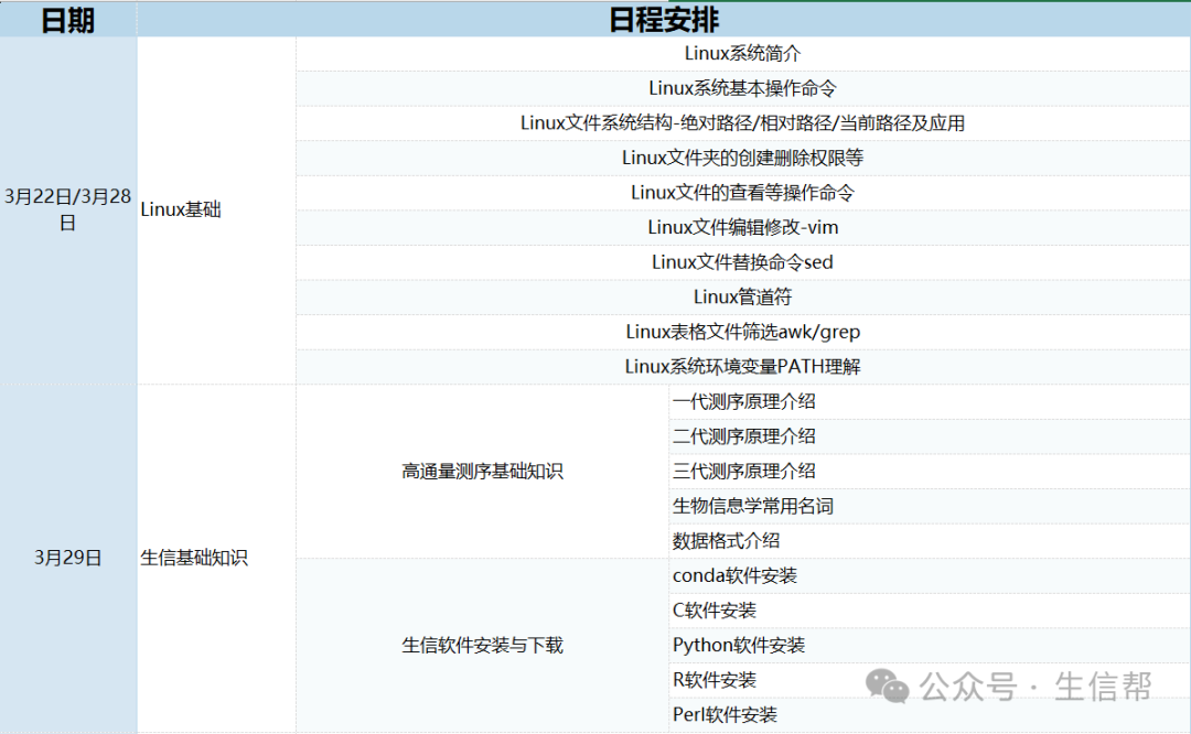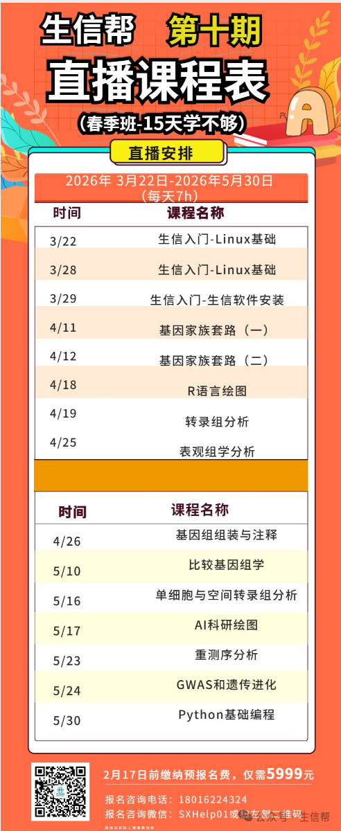 专为科研人打造的生信系统学习通道,15天时间,帮你从零突破,扎实掌握Linux/Python/R编程操作,搭建完整生信分析思维与流程,上手各类热门组学数据分析实战(详细课表见下文),搭配导师全程答疑与学员专属学习群,陪伴你稳步提升,轻松衔接后续科研工作。