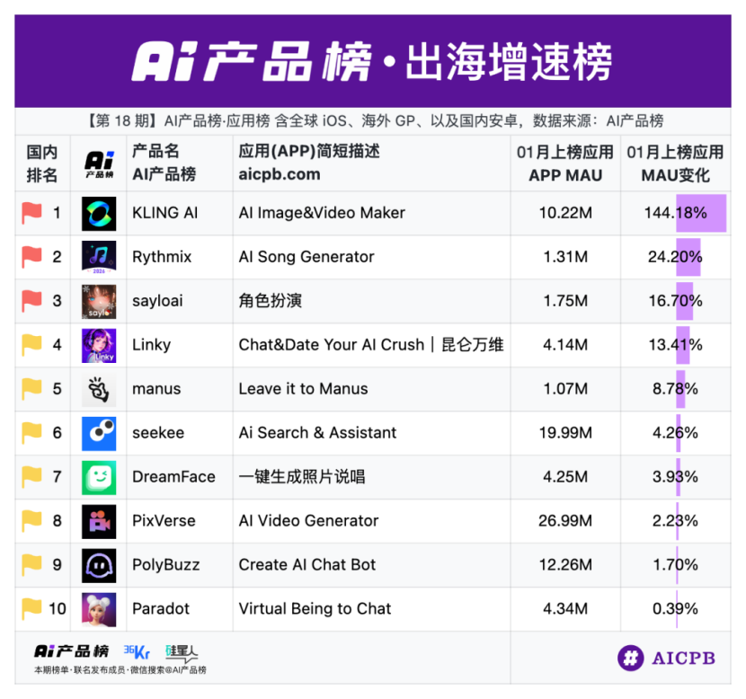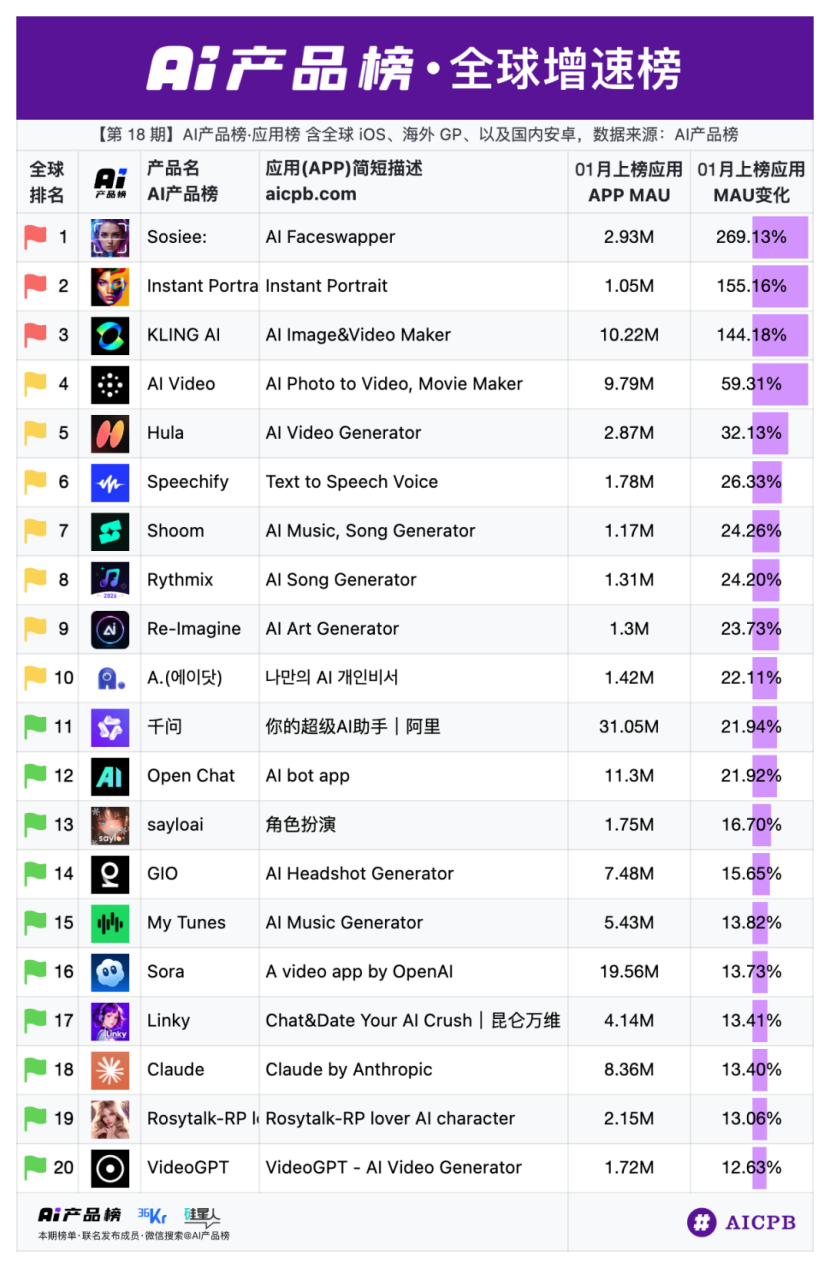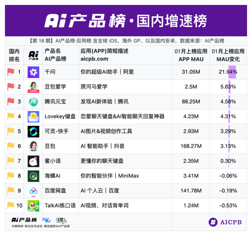 第18期AI产品榜·应用榜(APP)(2026年01月榜)由AI产品榜、36kr、硅星人联名发布。