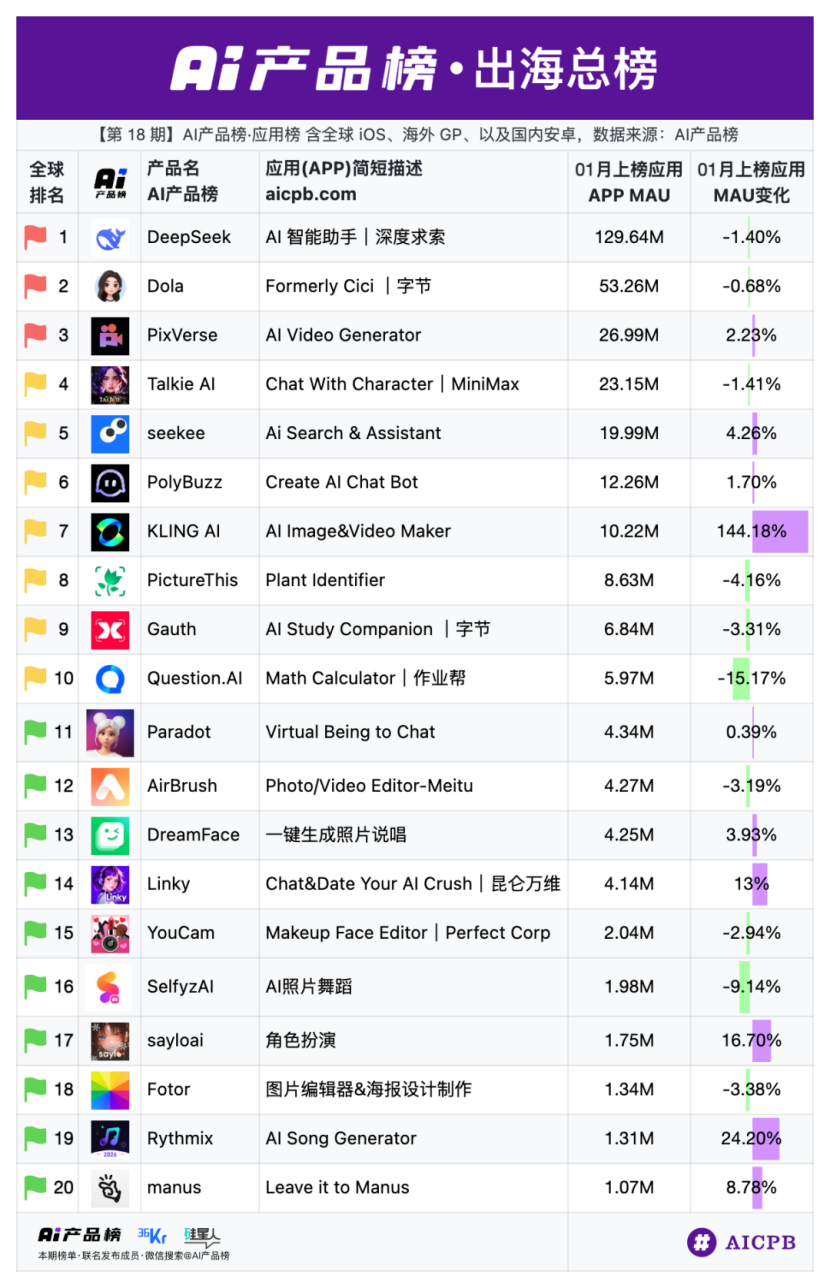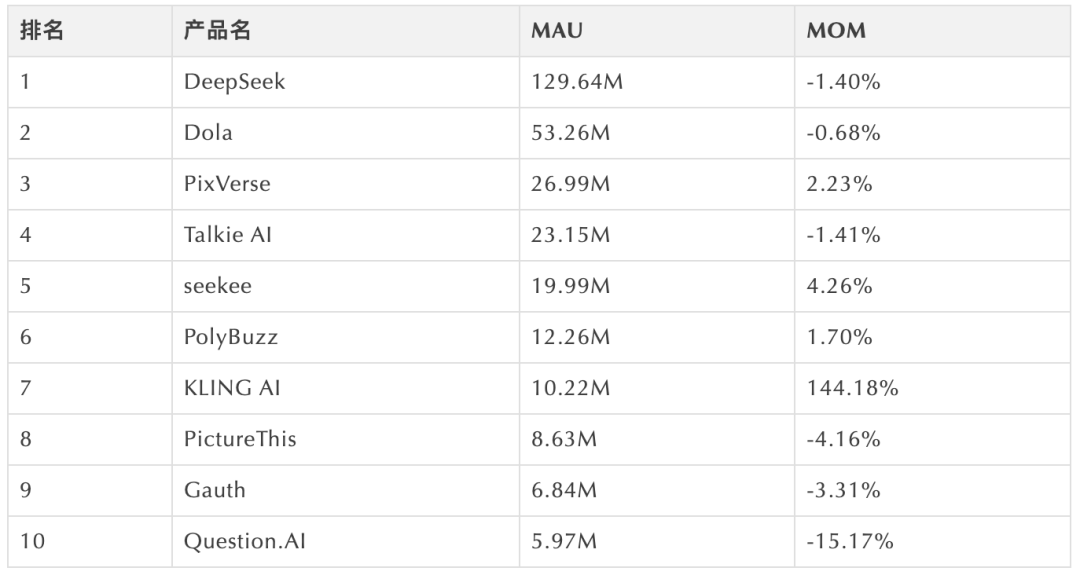 AI产品榜·出海总榜TOP10 DeepSeek以1.29亿MAU登顶,排名第二的是Dola字节旗下豆包海外版MAU 53.26M,环比微跌0.68%。