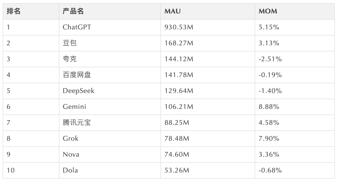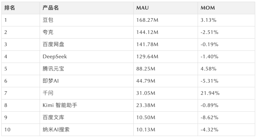 豆包以1.68亿MAU直接登顶国内榜首,3.13%