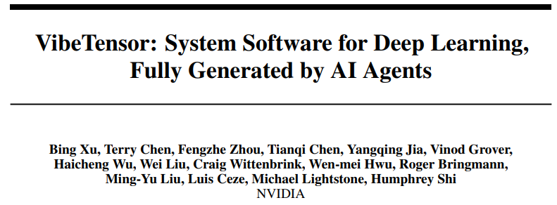 VibeTensor: System Software for Deep Learning, Fully Generated by AI Agents https://arxiv.org/pdf/2601.16238 代码:https://github.com/NVlabs/VibeTensor 这不是科幻。NVIDIA 研究团队近期开源的 VibeTensor ,正是这样一个由 LLM 驱动的编码智能体在人类高层指导下生成的深度学习系统软件栈。