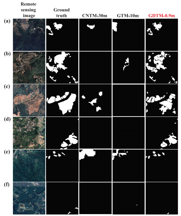 图 7.不同梯田分布图产品在选定验证点的梯田检测结果可视化对比。