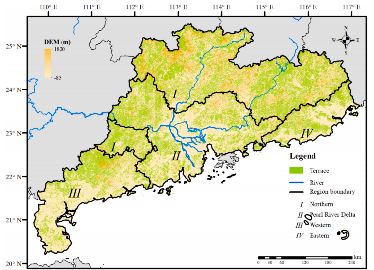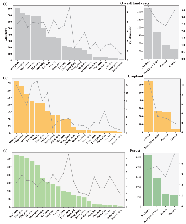 图 9.中国广东省梯田的量化分布。(a)各市及各区域梯田总面积;(b)各市及各区域耕地型梯田面积;(c)各市及各区域林地型梯田面积。