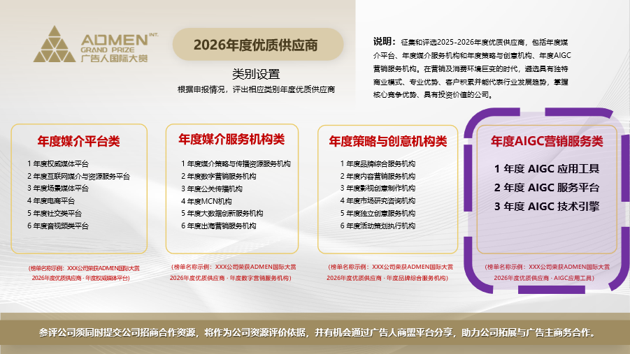 2026年,被誉为“行业风向标”的ADMEN国际大赏,以其一贯的敏锐与魄力,在机构类荣誉体系中重磅增设“年度AIGC营销服务机构”专属板块。这不仅是荣誉名录上的一次扩容,更是对营销生产力革命的一次官方认证与全景检阅。