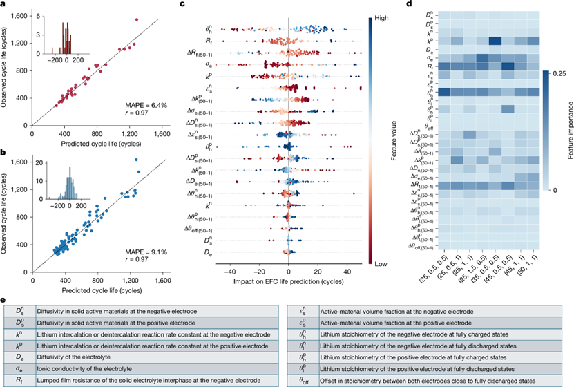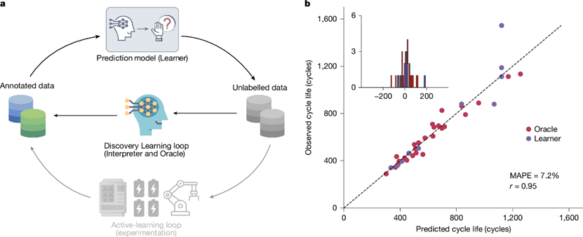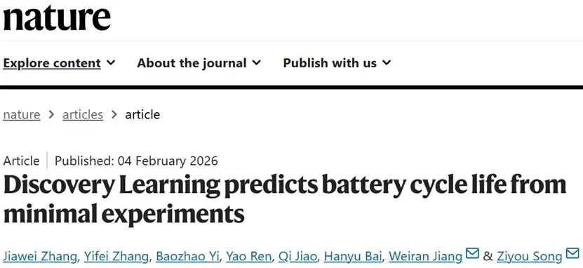 2026年2月4日,密歇根大学(新加坡国立大学)宋子由及孚能科技(美国)公司Weiran Jiang等研究者在Nature上发表了题为“Discovery Learning predicts battery cycle life from minimal experiments”的研究论文,提出了一种名为“Discovery Learning”的科学机器学习方法,其灵感来源于教育心理学中的发现学习理论,通过融合主动学习(active learning)、物理约束学习(physics-guided learning)和零样本学习(zero-shot learning),构建了一个类似人类推理过程的迭代推理循环。该方法能够从历史电池设计数据中学习,并大幅减少对新原型实验的依赖,从而仅基于极少实验(如前50次等效全循环)即可预测新电池设计的循环寿命。研究使用了一个包含123个大型锂离子软包电池的工业级数据集进行验证,结果表明,仅基于51%的电池原型数据,该方法便能以7.2%的平均绝对百分比误差预测循环寿命。在保守假设下,相较于传统工业验证方法,Discovery Learning 可以节省98%的时间与95%的能耗。这标志着在电池寿命预测领域向更高效、更环保的研发模式迈出了关键一步。