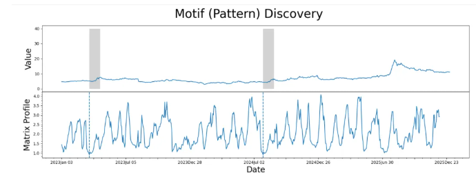 识别Motif:在Matrix Profile中寻找最低谷值,这些位置对应高度相似的序列对