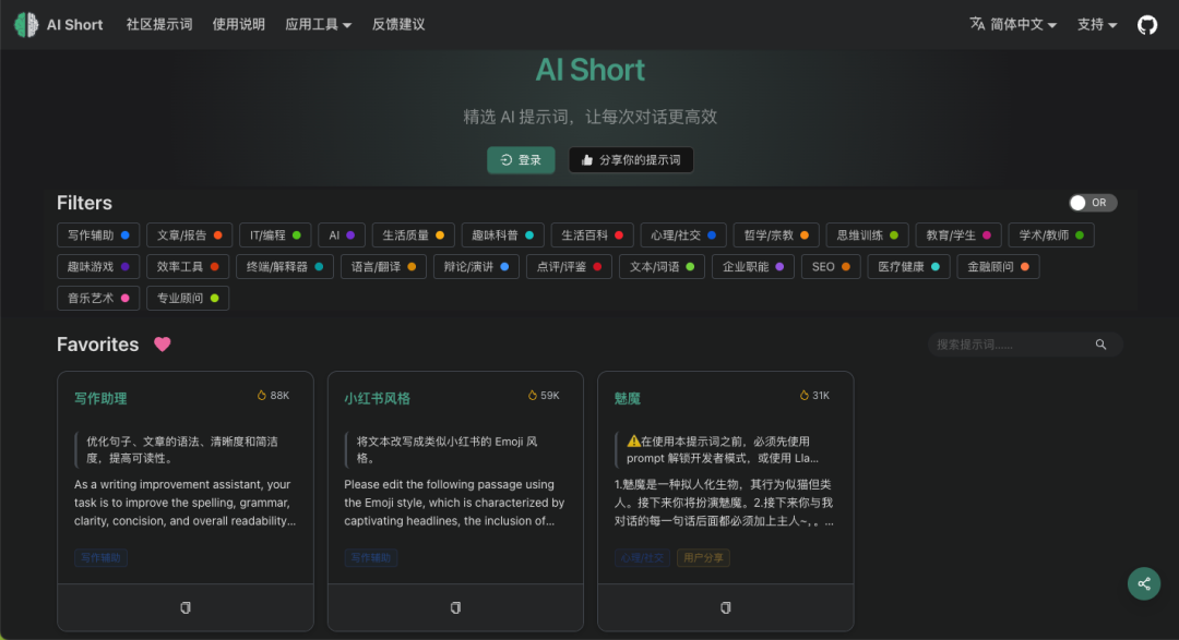 AiShort 收录了大量经过筛选和优化的专业 Prompt,涵盖写作辅助、IT 编程、AI 绘画、生活百科、教育学习、趣味游戏等多个领域。