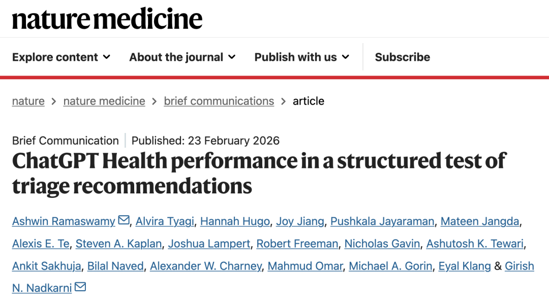 2026 年 2 月 23 日,西奈山伊坎医学院的研究人员在 Nature Medicine 期刊发表了题为:ChatGPT Health performance in a structured test of triage recommendations 的论文。